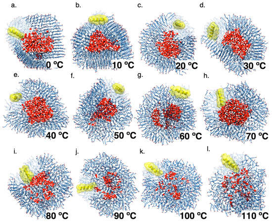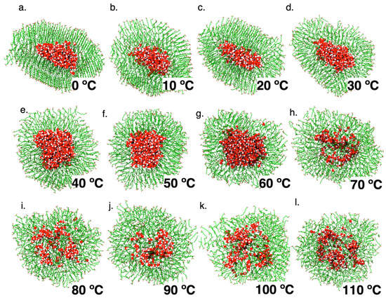 Table 1 summarizes the structural characteristics of the DA vesicles formed during the simulations at 0 °C to 100 °C, using the system at 25 °C as a starting configuration. Although the thickness of the membrane remains almost constant (from 1.4 nm to 1.5 nm), there are several temperature-dependent differences. According to DA Tm, at 40 °C the vesicle displays a spheroid shape with a defined water-filled inner compartment. According to the order parameter and DA monomer geometries, between 20 °C and 30 °C the bilayer displays a transitional state, with almost 80% of the inner-leaflet and ~30% of the outer-leaflet monomers adopting a fluid phase (Figure S1 in Supplementary Materials). As the temperature decreases, the vesicles gradually become larger, with both vesicle leaflets exhibiting a gel phase. Conversely, the simulated systems adopted a spherical geometry at temperatures above 50 °C, with a more diffuse and fluid DA membrane with both leaflets in the fluid phase (Table 1).