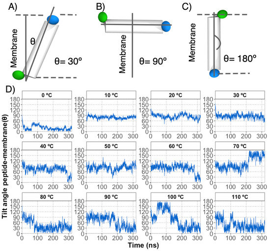 Although the trajectories show that the vesicles are formed in the temperature range tested, below 30 degrees they adopt a more defined spheroid shape, with a lower proportion of monomers adopting a liquid phase than equivalent DA-only simulations. Furthermore, the peptide affects both bilayer leaflets independently of the temperature assayed. Additionally, increased disorder and structural deformation near the peptide are observed. Interestingly, the peptide remains in the bilayer surface below 70 °C, and the internal DA layer appears to be less affected by the embedded peptide, while higher temperatures increase the peptide diffusion and the vesicle structure (Table S1, Figure S3 in Supplementary Materials). Finally, the time evolution of the tilt of the peptide axis with respect to the bilayer patch normal axis indicates that the bilayer asymmetry may result from the fact that the peptide does not adopt a similar or stable transmembrane orientation across different systems. It should be noted that below 10 degrees the peptide remains in its initial position (randomly defined) due to the phase adopted by the membrane, which correlates with the lower diffusion constant observed (Figure 4).