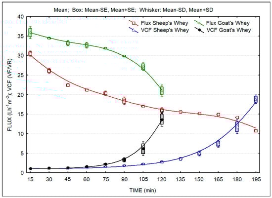 Figure 1 presents the evolution of the UF fluxes over time. The results are the average of two concentration trials. It is clear that higher filtration flux was obtained during the concentration of goat CW. In both cases, average fluxes are of the order of 30 and 20 Lm−2h−1, respectively for goat and sheep CW, which indicates the feasibility of the operation of ultrafiltration units in small-scale cheese plants, processing volumes of ca. 500–1000 L milk per day. The figure also presents the calculated evolution of the volumetric concentration factor during the concentration process. This information indicates that it is possible to concentrate whey to obtain high levels of protein and/or fat with the objective to obtain the desired levels of these nutritional components, namely protein, in the LWCs.