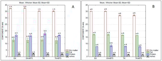 Composition of kefir samples produced with sheep (A) and goat (B) liquid whey concentrates. (Mean; Standard Deviation-SD). Different lowercase letters a, b, and c indicate significant differences (p < 0.05) among formulations produced with the same LWC. Different capital letters A and B indicate differences (p < 0.05) between each formulation produced with different LWC (sheep or goat). EK = Commercial kefir; EKABT5 = Commercial kefir + probiotic culture; TK = Traditional kefir; TKABT5 = Traditional kefir + probiotic culture.