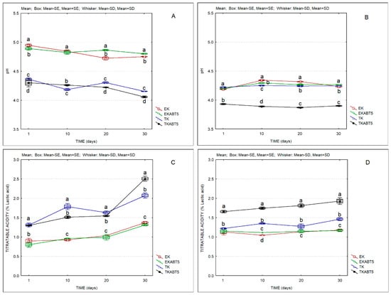 pH and titratable acidity of kefir samples produced with sheep and goat liquid whey concentrates. (A) pH of sheep kefir samples; (B) pH of goat kefir samples; (C) Titratable acidity of sheep kefir samples; (D) Titratable acidity of goat kefir samples. (Average values; Standard Error-SD; Standard Deviation-SD). EK = Commercial kefir; EKABT5 = Commercial kefir + probiotic culture; TK = Traditional kefir; TKABT5 = Traditional kefir + probiotic culture. Different lowercase letters a, b, and c indicate significant differences (p < 0.05) among formulations produced with the same LWC.