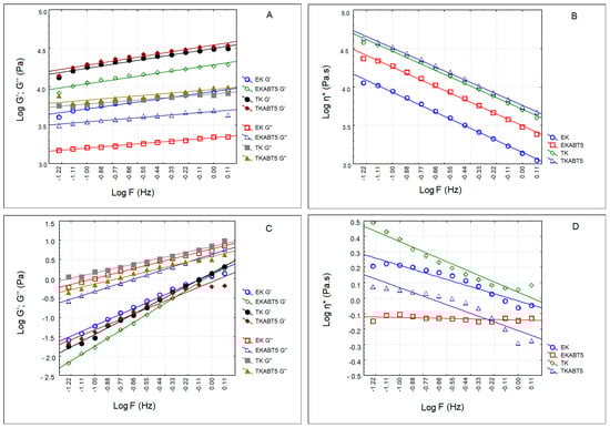 Elastic (G′) and viscous moduli (G″) and complex viscosity (η*) of kefir samples produced with sheep and goat liquid whey concentrate. (A) G′ and G″ of sheep kefir samples; (B) η* of sheep kefir samples; (C) G′ and G″ of goat kefir samples; (D) η* of goat kefir samples. EK = Commercial kefir; EKABT5=Commercial kefir + probiotic culture; TK = Traditional kefir; TKABT5 = Traditional kefir + probiotic culture.