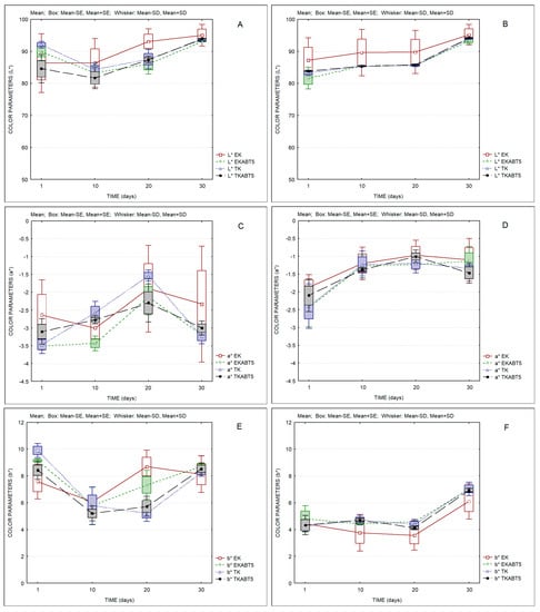 Color parameters of kefir samples produced with sheep and goat liquid whey concentrate. (A) L* of sheep kefir samples; (B) L* of goat kefir samples; (C) a* of sheep kefir samples; (D) a* of goat kefir samples; (E) b* of sheep kefir samples; (F) b* of goat kefir samples. (Average values; Standard Error-SD; Standard Deviation-SD). EK = Commercial kefir; EKABT5 = Commercial kefir + probiotic culture; TK = Traditional kefir; TKABT5 = Traditional kefir + probiotic culture.