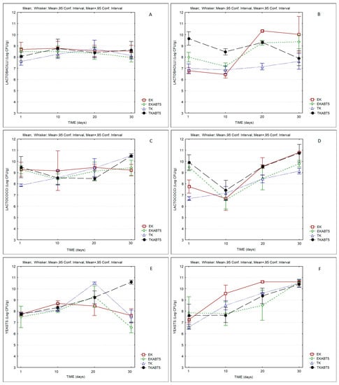 Microbial characteristics of kefir samples produced with sheep and goat liquid whey concentrate. (A) Lactobacilli counts of sheep kefir samples; (B) Lactobacilli counts of goat kefir samples; (C) Lactococci counts of sheep kefir samples; (D) Lactococci counts of goat kefir samples; (E) Yeasts counts of sheep kefir samples; (F) Yeasts counts of goat kefir samples (Average values and 0.95 confidence interval). EK = Commercial kefir; EKABT5 = Commercial kefir + probiotic culture; TK = Traditional kefir; TKABT5 = Traditional kefir + probiotic culture.