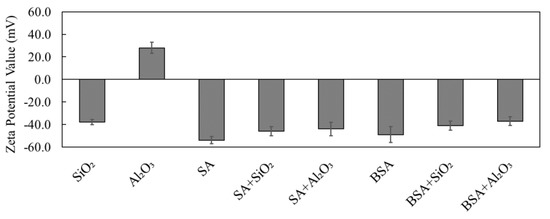 Measured zeta potential values of SiO2, Al2O3, SA, and BSA in single and combined solutions.