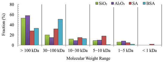 The molecular weight distribution (Figure 3) of model foulants was determined using the method detailed in Section 2.3. As can be seen, the SiO2 and Al2O3 colloids have a fairly similar size distribution in which the majority of particles (>55%) are larger than the MWCO of the UF membrane (100 KDa). The distribution of SA particles shows that 28% are larger than 100 KDa, and 35% are between 30 and 100 KDa. More than 30% of SA particles are smaller than 30 KDa. In contrast, 35% of BSA particles are larger than 100 KDa, whereas a larger percentage (>50%) of BSA particles are in the size range of 30–100 KDa. The differences in the size distribution of the model foulants are expected to influence their fouling and cleaning mechanisms.