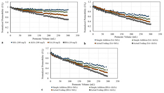 To investigate the fouling behavior of SA and BSA with and without the addition of SiO2 and Al2O3 colloids, Figure 4 shows the decline in membrane permeability (represented by the normalized permeability, J/J0). From Figure 4a, it can be clearly seen that during the filtration of SiO2 only, the decline in normalized membrane permeability was minimal, reaching a value of 0.95. The filtration of Al2O3 alone, however, resulted in a greater permeability decline compared to SiO2, with a final value of 0.82. As the size distribution of both SiO2 and Al2O3 (Figure 3) is fairly similar, the difference in the filtration performance of the two colloids could be attributed to the differences in the surface charge as determined by the zeta potential measurements (refer to Figure 2). The Al2O3 surface was positively changed, indicating a higher affinity to adsorb on the surface that causes a greater flux decline. Meanwhile, the SiO2 surface was negatively charged, and thus, higher repulsion forces between SiO2 and the membrane were expected. Therefore, less adsorption and the permeability decline were caused by SiO2 colloids. Similar results were observed in previous studies [19,20,21] in which inorganic colloids alone contributed to a smaller permeability decline. The results of our study suggest that the zeta potential also influences the fouling behavior of the inorganic colloid; that is, a larger permeability decline was found with the positively charged Al2O3 surface compared to the negatively charged surface of SiO2.