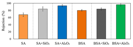 SA and BSA rejections in the presence and absence of SiO2 and Al2O3.