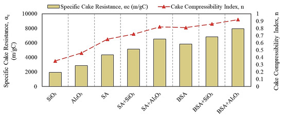 αc is a function of α0 (a constant related to the properties of particles forming the cake) and the cake compressibility index (n) [15] as shown in Equation (5):