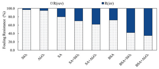 SA and BSA fouling during filtration with and without inorganic colloids was categorized into reversible and irreversible fouling to assess backwash performance. Figure 7 presents the determined fouling resistances for the different filtration conditions. It is shown that during the filtration of individual SiO2 and Al2O3 solutions, the reversible fouling (Rrev) was the highest and contributed to 95% and 92% of the total fouling resistance for SiO2 and Al2O3, respectively. This indicates that the fouling of individual inorganic colloids was mostly removable by backwash, which is reflected by the minimal decline in membrane permeability during filtration. Moreover, the fouling resistances correlate well with the cake formation fouling mechanism determined by the blocking law analysis (refer to Table 1). The irreversible fouling (Rirr) of SiO2 and Al2O3 was negligible compared to the reversible portion, which contributed less than 10% of the total fouling resistance.