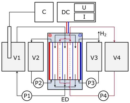 Lab-scale ED setup flow scheme: V1—diluate (feed) tank; V2—pre-cathode tank; V3—pre-anode tank; V4—concentrate tank; P1–4—pump; ED—electrodialyzer; DC—power supply; C—conductometer.