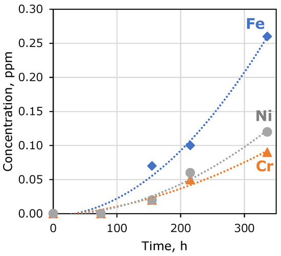 A significant excess of the concentration of iron in the oxidation products is understandable since nickel is initially an additive in the composition of stainless steel. It should be noted that the nature of the dependences obtained correlates with the data [9] obtained during the testing of a pilot plant. A comparative analysis of the above dependences shows that the nature of the curves for Fe, Cr, and Ni is the same. The higher absolute values of the concentrations of Fe and Ni cations are explained by the fact that in [9], the results of the absorption of CO2 from a real flue gas in which oxygen is present are presented, while in the experiments of this work, model solutions of carbonized MEA were used, which were not saturated with oxygen. According to the data given in [5], iron ions are catalysts for the oxidative degradation of MEA. Therefore, this circumstance leads to an exponential increase in the concentration of both iron and HSS anions (formates, oxalates et al.).