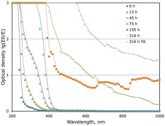 Optical density of the carbonized MEA solution at various exposure times (0–316 h) at 120 °C (line 336 h filt.—data for the filtered solution).