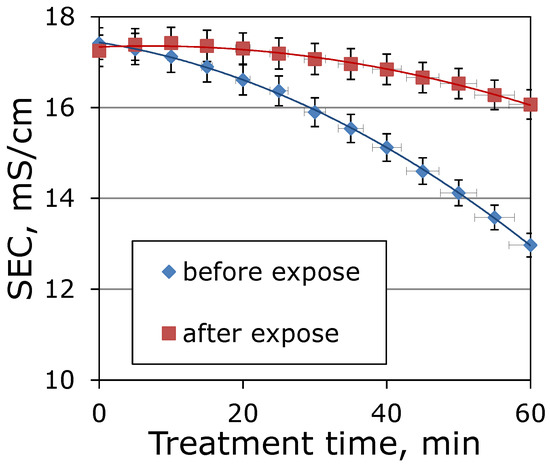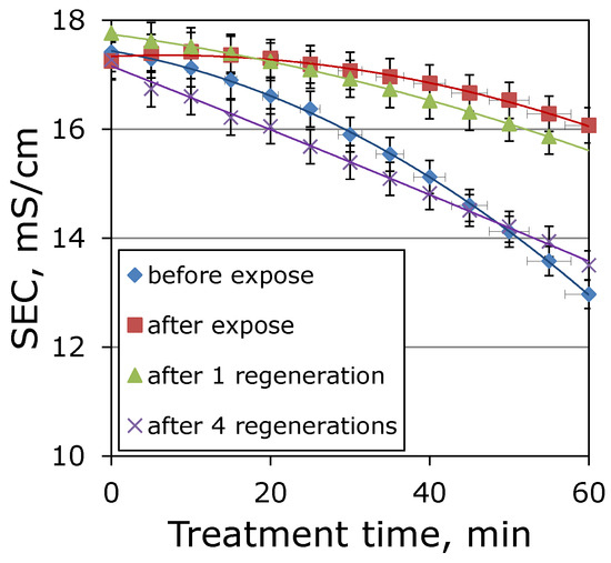 Electrodialysis of an alkaline solution of 5 g/L NaOH was carried out for 1 h. An aqueous solution with an alkali content of 5 g/L NaOH was supplied to the desalination chambers, and distilled water was supplied to the concentration chambers. At each repetition, the hydraulic circuits for desalting and concentrating were filled with fresh alkali solution and distilled water. The electrode chambers were filled with a sodium sulfate solution, which ensured high conductivity in the electrode chambers. The kinetics of changes in electrical conductivity for membranes before and after regeneration is shown in Figure 7.
