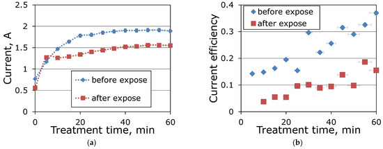 Dependence of the current strength (a) and current efficiency of carbonate ions removal (b) on the time of electrodialysis of a model MEA solution with carbonization degree of 0.2 mol CO2/mol MEA: before exposure—fresh membranes, after exposure—membranes after 6 months of contact with a model degraded MEA solution.