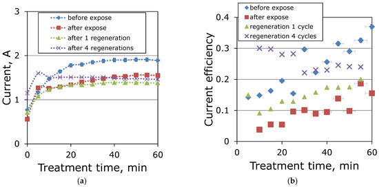 Dependence of the current strength (a) and current efficiency of carbonate ions removal (b) on the time of electrodialysis of a model MEA solution with a carbonization degree of 0.2 mol CO2/mol MEA: before exposure—fresh membranes, after exposure—membranes after 6 months of contact with a model degraded solution of MEA, after 1 regeneration—membranes after one cycle of ED of NaOH solution; after regeneration—membranes after 4 regeneration cycles in NaOH solution 5 g/L.