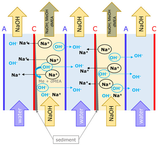 Schematic representation of ion transport during alkaline membrane regeneration.
