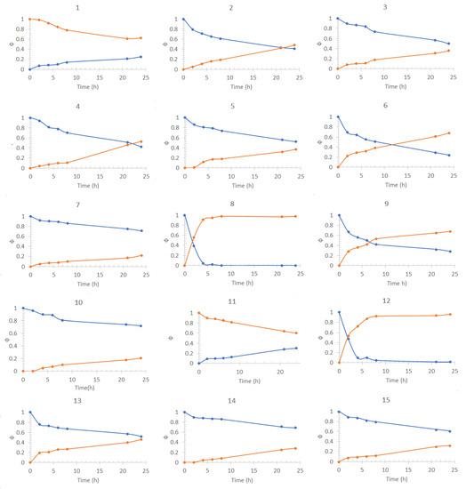 Figure 2 presents the transport profiles obtained for each of the DOE experiments carried out for the optimization of Cd(II) transport. They graphically represent the fraction of the metal species present in the feed phase (, depletion) or the stripping phase (, recovery) at different pertraction times. The fraction of species is defined as