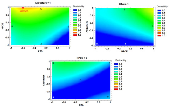 In Figure 3, contour plots of the desirability function are shown. Intermediate to high NPOE content with high Aliquat 336 and low CTA content makes the best PIMs. According to the response surface, an optimal desirability value of 0.81 may be achieved at −0.60 CTA, 1.0 NPOE, and 1.0 Aliquat 336 PIM coded composition. However, this PIM was fragile and difficult to manipulate. Membrane 8 of Table 3 (−1.0 CTA, 0.0 NPOE, 1.0 Aliquat 336) reached a desirability of 0.77, representing a non-significant difference with respect to the optimum value. As it has been reported that an excess of plasticizing agent can create an additional barrier for the transport of the metal ion, decreasing the mechanical resistance of the membrane [57] and increasing the possibility that it exudes towards some of the aqueous phases of the system, thus decreasing stability, adequate manipulation characteristics of the PIM at this composition were attained. Further experiments were performed using the composition levels of membrane 8.