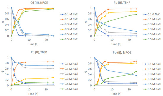Pb(II) and Cd(II) fractions transport profiles in the feed phase (downward curves) and the stripping phase (upward curves) obtained for the three different plasticizers at different NaCl concentrations in the feed phase. Feed phase: [Metal(II)] = 1 × 10−4 mol/dm3, pH = 6.5, variable NaCl. Stripping phase: [HNO3] = 0.1 mol/dm3.