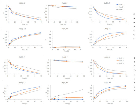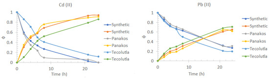 Pb(II) and Cd(II) fractions transport profiles in the feed phase (downward curves) and the stripping phase (upward curves) obtained using synthetic seawater, Panakos commercial seawater, and water collected on Tecolutla beach. Feed phase: [Metal(II)] = 1 × 10−4 mol/dm3 in different seawater samples. Stripping phase: [HNO3] = 0.1 mol/dm3.