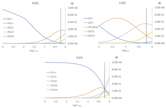 Speciation of the metal ions as a function of the content of HCl medium according to the ChemEQL v3.2 software.