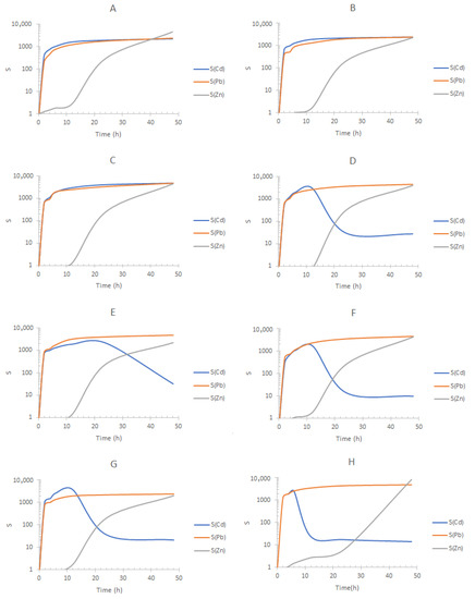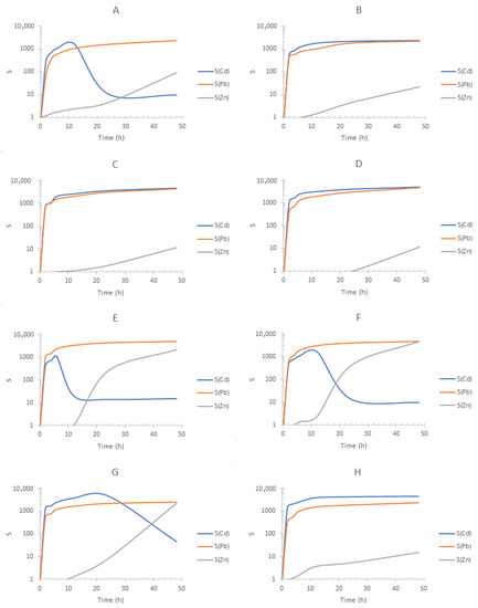 In all experiments, removal of Pb(II) to S2 inhibits its migration to S1. According to the separation profiles obtained for the experiments using seawater from Tecolutla Ver. Mex. (Figure 11), similar conclusions to those previously pointed out can be drawn showing experiments B–D and H as the best separations. Therefore, compositions corresponding to experiments B and C allow S(Cd) and S(Pb)~1000 and 10 < S(Zn) < 1000, depending on the possible amount of DOM and content of concomitant metal ions. As for the values of S(Zn), it is important to remark that lower values in comparison to the other metals are observed, as at the beginning, the three metal ions are present in F, which is not the case for S1 and S2. Additionally, the fact that Zn(II) migrates to S1 once Cd(II) transport has been accomplished allows also the possibility of replacement of S1 with a fresh solution to separate Zn(II) in an additional stage.