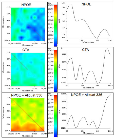 (Right column): RIMM maps obtained for NPOE (1520 cm−1), CTA (1750 cm−1), and NPOE + Aliquat 336 (2923 cm−1). (Left column): cross-section showing the variations of the measured absorbances along the lines indicated in the maps.