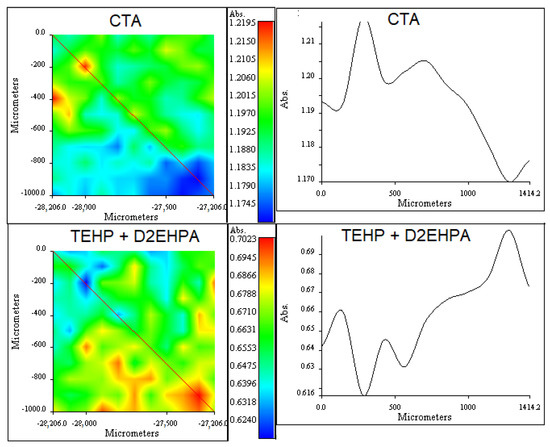 (Right column): RIMM maps obtained for CTA (1750 cm−1) and TEHP + D2EHPA (727 cm−1). (Left column): cross-section showing the variations of the measured absorbances along the lines indicated in the maps.