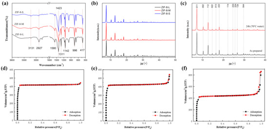 FTIR (a), XRD spectra (b,c), and N2 adsorption/desorption isotherms of ZIF−8 particles (d) ZIF−8(L); (e) ZIF−8(M); (f) ZIF−8(S).