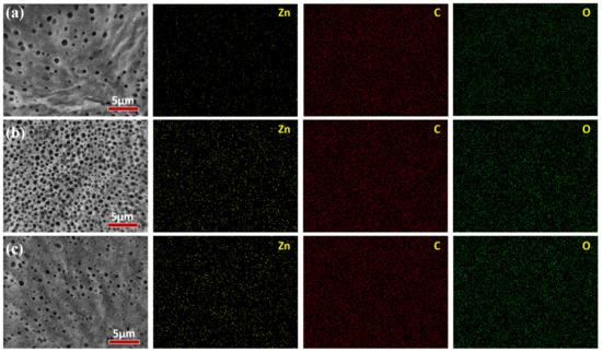 The morphology of ZIF−8/PEG MMMs were characterized by SEM and EDS, as shown in Figure 3 and Figure 4. As shown in Figure 3, porous PVDF exhibited sponge-like pores in the cross-section. The PEG selective layer integrated tightly with the PVDF support layer, and no obvious interface defects were observed, which might be ascribed to the leakage of PEG into the substrate. There was no obvious ZIF−8 particle aggregation in the cross-section of ZIF−8/PEG MMMs, even with 15 wt% particle loading. However, unlike common composite membranes, an abundance of blowholes appeared on the membrane surface and the cross-section near the membrane surface, which might be ascribed to the footprints left by the rapid volatilization of the solvent and the TMA catalyst molecules in the cross-linking process. Most portions of the cross-section of the selective layer were dense, especially for the ZIF−8/PEG MMMs. The porous membrane surface might be favorable to the sorption of thiophene/n−heptane molecules, and the dense portion of the PEG layer might provide enough selectivity. Based on the EDS analysis, the Zn2+ atom distributed homogeneously on the membrane surface, and the density of Zn2+ gradually increased with increasing particle loading, indicating that ZIF−8 dispersed evenly in the MMMs.