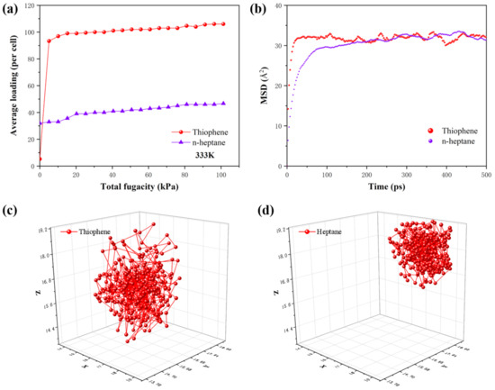 Figure 6 showed the adsorption isotherms (a) and the MSD (b) of the thiophene and n−heptane molecules in ZIF−8 at 333 K. As shown in Figure 6a, the adsorption capacity of ZIF−8 for thiophene was much higher than that for n−heptane, which indicated that ZIF−8 exhibited a preferential adsorption for thiophene molecules. The incorporation of ZIF−8 particles into PEG might enhance the sorption selectivity of membranes. The dynamic simulation tests were conducted three times, and similar results were obtained. As shown in Figure 6b, the slope of MSD for thiophene was much larger than that for n−heptane, which indicated that the diffusion coefficient of thiophene might be larger than that of thiophene in ZIF−8 [36]. The trajectory of the thiophene and n−heptane molecules also confirmed this conclusion, as shown in Figure 6c,d. The diffusion trajectory range of thiophene was significantly larger than that of n−heptane, which also suggested the higher diffusion rate of the thiophene molecules. The simulation results indicated that ZIF−8 particles possessed both high sorption and diffusion selectivity for thiophene, which might be favorable to enhancing membrane selectivity and permeability.