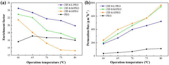The effect of ZIF−8 particle size on the pervaporation performance of the ZIF−8/PEG MMMs (ZIF−8 loading of 15 wt%) in the range of 60–80 °C is shown in Figure 7. It was found that PEG-based MMMs filled with larger ZIF−8 particles showed much higher sulfur enrichment factor and lower permeation flux than those with smaller ZIF−8 particles. ZIF−8−L/PEG MMMs reached a maximum sulfur enrichment factor of 24.5 with a permeation flux of 183.2 g·m−2·h−1 at 60 °C, which was much higher than those of pure PEG and ZIF−8−M/PEG MMMs, as well as ZIF−8−S/PEG MMMs. This was probably due to the intrinsic differences in the porous structure of ZIF−8 and the connectivity of the transport channels created by the ZIF−8 particles. The transport mechanism in PEG MMMs made up of different ZIF−8 particle size is proposed in Figure 8. Larger ZIF−8−L particles provided more and longer selective transport channels in one single particle compared with smaller ZIF−8−S particles, which might contribute to the higher selectivity for thiophene but lower diffusion rate. Smaller ZIF−8−S possessed similar micro-pore volumes, but significantly more meso- and macro-pores than larger ones, which might provide more larger porous channels for small molecules and contribute to higher permeation flux while sacrificing some selectivity. Moreover, the number of ZIF−8−L particles in the MMMs was lower than that of the smaller particles with same particle loading, which might weaken the connectivity between adjacent ZIF−8−L nanoparticles and result in low-efficiency molecular transport in the membrane. The distance among ZIF−8−S particles in MMMs was smaller than that of ZIF−8−L with the same particle loading, which might provide relatively continuous transport channels and be beneficial to rapid diffusion across membrane. Besides, the surface area available for the mass transport was larger for MMMs with ZIF−8−S particles due to the larger specific surface area of the smaller ZIF−8 particles, which might also contribute to higher permeability in ideal MMMs. Monsalve-Bravo et al. [37] also reported similar results showing the increasing permeability of MMMs resulting from decreasing the particle size.