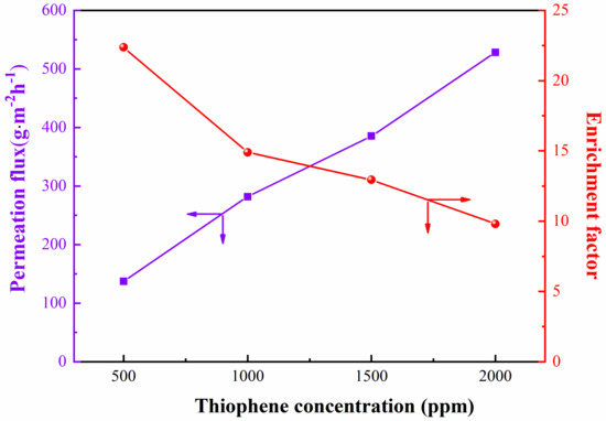The effect of feed concentration on the pervaporation performance of ZIF−8−L/PEG MMMs was investigated, as shown in Figure 10. With increasing feed concentration, the total flux increased, while the sulfur enrichment factor decreased. This might be attributed to the ZIF−8 particles have a strong affinity for thiophene. As the thiophene concentration in the feed increased from 500 ppm to 2000 ppm, the membrane swelling might be enhanced due to the strong adsorption capacity of ZIF−8 particles for thiophene. As the dynamic diameter of n−heptane (0.43 nm) was smaller than that of thiophene (0.53 nm), the increase in n−heptane permeate flux due to membrane swelling might be much higher than that of thiophene, resulting in a decrease in the sulfur enrichment factor.