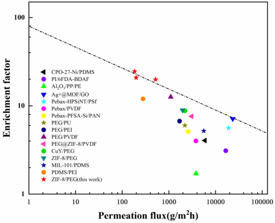 Compared with other desulfurization membranes, ZIF−8/PEG MMMs exhibited a higher enrichment factor, but much lower permeation flux, as shown in Figure 11. The enhancement of the enrichment factor was mainly attributed to the selective transport channels and adsorption sites provided by ZIF−8 based on Zn2+ and S coordination interaction, which facilitated the selective sorption and mass transfer of the thiophene molecules. The much lower permeation flux might have resulted from the higher molecular weight of the PEG chains and the greater thickness of the selective layer, as well as the lower operation temperature. Moreover, the intrusion of PEG polymers into the PVDF porous substrate also increased the mass transport resistance, which decreased the permeation flux. Future work should concentrate on the improvement of the permeation flux of ZIF−8/PEG MMMs without sacrificing the enrichment factor by decreasing the membrane thickness of the selective layer and pre-wetting the substrate to prevent polymer chain intrusion. The interfacial micro-structure and intrinsic sorption–diffusion properties of guest molecules in the ZIF−8 particles might play an important role in desulfurization performance, which should be investigated further to clarify the mass transfer mechanism of guest molecules in MMMs.