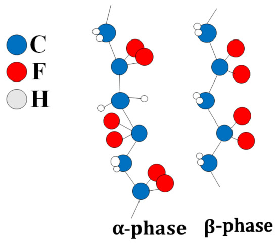 PVDF has several polymorphic states: α, β, γ, δ-phases. It is characterized by a regular structure in which most of the PVDF units are connected head-to-tail, and only a small number are linked head-to-head [35,36] (Figure 1). The C-F bonds are polar, and the maximum dipole moment is achieved when all dipoles of the polymer molecule are aligned in the same direction. This structure corresponds to the β-phase of PVDF [37]. Optimal piezoelectric characteristics of the polymer are achieved when it contains the β-phase. Alpha-crystallite dipole moments are oriented in the opposite direction, resulting in zero polarization.