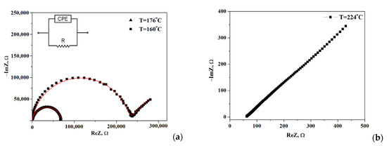 The impedance spectra of the composite polymer electrolytes (1-x)CsH2PO4-xF-2M are presented in Figure 4 for x = 0.2. Note, the impedance measurements were carried out for each point on the temperature dependence of the conductivity. Moreover, for all samples, the Nyquist plots (Z′ vs. Z″ as a parametric function of frequency) were repeatedly reproduced including 2–3 samples for each composition. The Nyquist plots at temperatures 176 °C and 224 °C show the dependencies for the high- and low-temperature regions, respectively. The impedance hodographs are represented by a semicircle with a much smaller radius at higher temperatures (T = 176 °C) and a semicircle combined with a straight line with a 45° angle to the abscissa at T = 160 °C. The resistance of the obtained electrolytes was estimated from the point of the intersection with the minimum of the imaginary component on the real axis. Impedance hodograph at T = 176 °C can be approximated by the equivalent circuit, consisting of a parallel combination of resistance® and a constant phase element (CPE) (Figure 4a, inset) with the fitting parameters R = 7.06 × 104 Ω, Q = 3.04 × 10−10 F, α = 0.92, where Q is the capacitance of the constant phase element, α is the degree of deviation from the values for pure capacitance. For the hodograph at a T = 160 °C semicircle is combined with the Warburg impedance and the fitting parameters R = 2.28 × 105 Ω, Q = 5.75 × 10−10 F, α = 0.91, Aw = 1.44 × 105. The approximation error was less than ≤2%. The impedance spectrum at high temperatures (T = 224 °C, Figure 4b) is represented by a straight line which is due to the fast proton conductivity through the electrolyte and corresponded to the electrode resistance at the lower frequencies. Such spectra are characteristic of superionic phases [3].