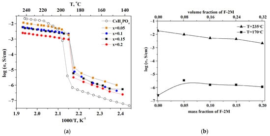 The observed jump in the proton conductivity of CsH2PO4 due to the superproton phase transition is four orders of magnitude (Figure 5a). The dependence of the proton conductivity on the temperature was investigated for the samples with different ratios of the polymer additives. For clarity, the temperature dependencies are shown in Arrhenius coordinates. The measurements were carried out for 2–3 samples for each composition. The temperature dependence of the proton conductivity in the composite polymer systems (1-x)CsH2PO4-xF-2M is similar to that of the original salt and is characterized by the low-temperature (LT) and high-temperature (HT) regions. The obtained tablets with x = 0.05; 0.1; 0.15 have approximately close values of the proton conductivity in the HT phase and decrease by up to five times compared to the CDP. The conductivity of the samples with x = 0.2 and x = 0.25, which were obtained in the form of the thin films, decreases by 1–1.5 orders of magnitude compared to the pure CsH2PO4. The activation energy of the conductivity for the polymer systems is equal to 0.4 eV for the superionic region and about 0.8 eV for the low-temperature range and is close to the pure CsH2PO4. Isotherms of the proton conductivity of (1-x)CsH2PO4-xF-2M composites for different temperatures depending on the mass and volume fraction of the polymer are presented in Figure 5b. In the low-temperature region (T = 170 °C), the proton conductivity of the polymer electrolytes increases with x growth due to the slight disordering and amorphization of acid salt. That is consistent with the XRD and FTIR data for CsH2PO4-F-2M composites.