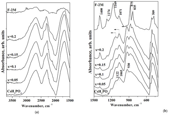 FTIR spectra of CsH2PO4, F-2M, and (1-x)CsH2PO4-xF-2M polymer composites are presented in Figure 6. The FTIR spectrum of CsH2PO4 has two ranges: the intensive absorption bands (a.b.) at 2800–1700 cm−1 related to the stretching (νOH) and the overtones of the bending vibrations of OH− groups involved in hydrogen bonds (Figure 6a), and 1300–500 cm−1, corresponding mainly to the spectral range of νPO4 tetrahedra (Figure 6b). Figure 6a shows the system of the strong hydrogen bonds for CsH2PO4 [42]. The range of 1500–500 cm−1 of FTIR spectra for F-2M corresponds to the main characteristic absorption bands. The intensive a.b. 1400 and 1169 cm−1 are related to the antisymmetric and symmetric stretching vibrations of the CF2 groups, respectively, while the a.b. at 1071 cm−1 is associated with the antisymmetric stretching vibrations of fluorine in CF2 [43,44]. The intensive absorption bands of 1274 and 875 cm−1 deal with CH2 wagging and stretching vibrations, while the a.b. 835 cm−1 belong to the rocking CH2 and stretching CF2 groups. The absorption band 509 cm−1 corresponds to the CF2 bonds of the carbon chain [45,46]. All the absorption bands of CsH2PO4 remain in the polymer systems with an increase in the weight fraction of the F-2M matrix, and FTIR spectra of the polymer membranes are similar to the pure CsH2PO4. Further, with the increasing polymer fraction, the additional absorption bands in the spectral range of PO4 tetrahedra appear due to the superposition of the a.b. of the components. With x increase up to x = 0.2 the a.b. in the range of 1400, 1274, 875, 835, and 509 cm−1 appear in the polymer membranes in the addition to FTIR spectrum of CsH2PO4. It should be noted that there is only a slight change in the positions of absorption bands of CsH2PO4 in the polymer composites with the increase of F-2M. The absorption bands of 930 and 1122 cm−1 shift to the 939 and 1133 cm−1, respectively at x = 0.2, which is related to the strengthening of P-O bonds in the polymer system. Thus, the data from both FTIR spectra and XRD are consistent and confirm the stability of the CsH2PO4 in the polymer composites with insignificant changes due to the interface interaction of the components and the salt dispersion. It is likely that the weak interface interaction with the negligible strengthening of the P-O bonds determines the shift in the phase transition to the lower temperatures and the expansion of the range of the high-temperature phase of CsH2PO4 in a polymer matrix.