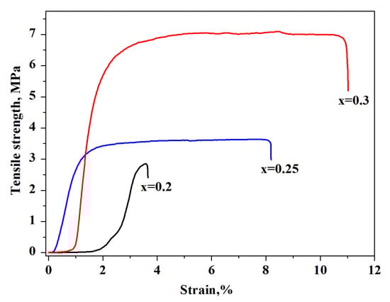 For the thin-film membranes (x = 0.2–0.3 and thickness of ~60–100 μm) the tensile strength was measured as the load at which the sample failed. Before determining the mechanical characteristics, the films were prepressed for densification. The value of the breaking stress was increased with the increase in the mass fraction of F-2M. The maximum value of the breaking stress of a thin-film composite membrane was ~7 MPa for x = 0.3 (44 vol.%). The relatively high characteristic of the tensile strength of ~3.5 MPa for x = 0.25 (37.7 vol.%) was also shown (Figure 7). The obtained tensile strength values are high, close to [26], and suitable for intermediate fuel cells.