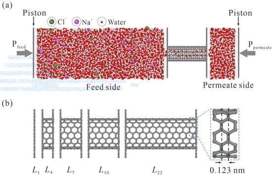 Schematic of the simulation model. (a) NaCl solution and pure water are placed on the feed and permeate sides, respectively. The pressure difference is exerted on graphene pistons to simulate liquid transport through CNT. (b) Side view of CNTs with different lengths. The subscript in Li represents the number of carbon rings. The L1 case is, in fact, a NPG monolayer.