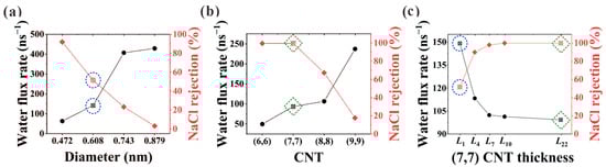 The following supporting information can be downloaded at: https://www.mdpi.com/article/10.3390/membranes13050525/s1, Figure S1: Water flux of thickness-variant (7, 7) CNTs versus simulation time; Figure S2: Thickness-dependent (a) water flux rate and (b) NaCl rejection in (6, 6), (7, 7), (8, 8) and (9, 9) CNTs.