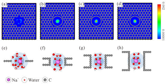 The first step is to set the pressures on both pistons on the feed and permeate sides to the ambient pressure of 0.1 MPa. The desalination system is then allowed to relax for 5 ns under these conditions. After the system reaches equilibrium, the desired pressure of 400 MPa is applied to the piston on the feed side, and the Ppermeate remains unchanged. As a commonly used strategy to control the simulation time in MD simulations, a higher pressure value than the practical desalination pressure is adopted to increase the computational efficiency [30,31]. The linearly increasing water flux with simulation time indicates that the simulation system reaches the steady state, as shown in Figure S1. All the simulations are run until 80% of the water molecules on the feed side are transported to the permeate side, and the corresponding water flux rate and NaCl rejection rate are calculated [32]. As commonly used in many works, NaCl rejection is defined as the 100 percent subtracting ratio of the ion concentrations in the permeate and feed sizes [22,30]. To maintain electrical neutrality, the number of permeating Na+ and Cl− is almost the same. Hence, the NaCl rejection calculation is based on the permeating Na+ number.