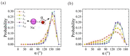 Next, we examine the orientation of water molecules within hydration shells. Here, α is used to represent the angle between the oxygen-ion vector and the water dipole vector. Its probability distribution within the first and second hydration shells is plotted in Figure 4. Due to the strong electrostatic interaction between the oxygen atoms and the positive charge that the Na+ ion carries, the probabilities of α in the first and second hydration shells reach peak values at around 155° and 145°, respectively. With the increase in membrane thickness, α distribution probability becomes narrower and sharper. For the α probability in the first hydration shell in Figure 4a, the two-column patterned water molecules in the first hydration shell start to form in L4 CNT and exhibit highly ordered orientation in L7 CNT. A slightly higher peak value is observed in L22 CNT. As for the water molecules in the second hydration shell in Figure 4b, the discrepancy between the NPG and CNT membranes is clearly observed. The ordered second hydration shell starts to form in L7 CNT and is further strengthened with the increase in membrane thickness. The overall orientation distribution trend is consistent with the above analysis of hydration structures. To sum up, the ordered water chain structure within CNT can regulate the water configuration within the hydration shell. The competition between the ordered water chain structure and the hydration shell is the origin of the preference for ion position. It is easy to imagine that the narrow ion path in thicker CNTs would exert a larger resistance for ion passage in practical desalination applications, and thus a larger salt rejection would be rendered. Once the confined and concentrative path is formed in L7 CNT, the resistance remains unchanged with further increases in CNT thickness.