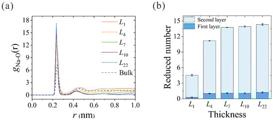 The ion hydration configuration within the nanochannels is closely related to their dehydration process. Using the aforementioned spring-tethered Na+ ion model in thickness-variant CNTs, the ion-oxygen radial distribution functions (RDFs) of Na+ in different CNTs are calculated, as shown in Figure 5a. The corresponding coordination numbers in the first (Nc1) and second (Nc2) hydration shells are summarized in Table 1. In accordance with the previous results, 5.6 and 17.1 water molecules were found in the first and second hydration shells [33,34,35]. The reduced number of water molecules in different CNTs is depicted in Figure 5b. When the Na+ ion enters the L1 NPG, about 4 water molecules are peeled from the second hydration shell, while the first hydration shell remains almost intact in spite of the deformation. Starting from the thinnest L4 CNT, dehydration occurs in both shells, and the reduced water number in the first hydration shell stabilizes at around 1.0. With the increase in CNT thickness to L7, the reduced water number in the second hydration shell rises from 10.0 to 12.7 and remains almost constant with the further increase in membrane thickness. This further confirms that the actual reduced number in ion dehydration is constant when the CNT membrane is thick enough to form a complete two-column water chain within the hydration shell. Despite the Na+ ion being artificially tethered within the nanochannel, the number of dehydrated water molecules can clearly manifest the dehydration energy barrier that the ion needs to overcome to squeeze through the narrow path inside the CNT. This conclusion is consistent with the unchanged dehydration degree above a certain thickness [22], as the input energy is not large enough to make the Na+ ion peel almost 13 water molecules from the second hydration shell to cross CNTs thicker than L7.