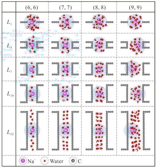 Generally speaking, this thickness effect applies to all the CNT diameters considered in this work, as shown in Figure 6. Similar to the case in (7, 7) CNT, intact hydration shells start to form at the L7 length in (6, 6) CNT. Nevertheless, the extreme confinement in L1 NPG could block almost all the ion passage. The increase in CNT thickness makes no significant contribution to salt rejection improvement but undermines the water flux rate instead, as shown in Figure 2a,b. For the (8, 8) and (9, 9) CNTs, water molecules exhibit four and six columns of chain structure, respectively [36]. As shown in Figure 6, the CNT length needed for intact hydration shells is larger than L7, and the position shift of Na+ ions originating from the competition between the hydration shell and ordered water chain can also be observed. Combined with the thickness-dependent salt rejection lines in Figure S2b, the critical thickness values in (6, 6), (7, 7), (8, 8), and (9, 9) CNTs are L1 (0.34 nm), L7 (1.078 nm), L10 (1.447 nm), and L10 (1.447 nm), respectively. On the one hand, the diameter-dependence of the critical thickness value stems from the weaker confinement in large CNTs. On the other hand, in spite of saturated salt rejection in (8, 8) and (9, 9) CNTs, the actual salt rejection capacities are still inefficient and unsatisfactory. In practical desalination applications, the operating pressure is usually not higher than 10 MPa, which may loosen the restriction on the CNT diameter [30]. It has been found that the ideal size of the CNTs for desalination applications can be as large as 1.1 nm in diameter [37]. Hence, the (8, 8) and (9, 9) CNT membranes can be used for ideal salt rejection, and a larger critical thickness value may be expected in practical devices. Compared with the previously reported critical thickness of 2.34 nm [22], although differences exist in specific details, the nature of enhancing water permeation at the cost of ion rejection through proper choice of CNT thickness is exactly the same.