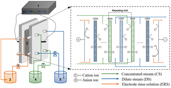 Schematic electrodialysis (ED) setup containing (1) a DC power supply, (2) a membrane stack with ten repeating units, (3) a tank of ERS, (4) a tank of CS, (5) a tank of DS, and (6–8) three circulating pumps.
