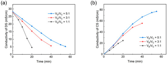Changes in the conductivity in the (a) DS tank and (b) CS tank at different volume ratios (VD/VC).