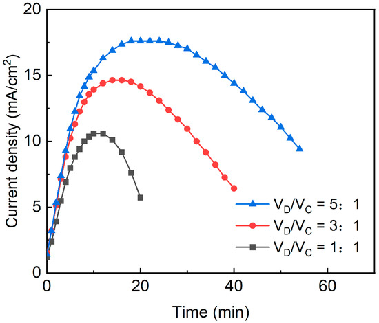 The variation of the current density with time is shown in Figure 4, from which it can be observed that the current density always showed a trend of first increasing and then decreasing with time for different volume ratios. This is caused by changes in the dominant part of the resistance of the ED stack. The deionized water used as a draw solution in the early stage and the low-salinity wastewater in the later dilution zone successively have a high contribution to the total resistance. This point is also exhibited in Figure 3. At larger volume ratios, the current density was generally at a higher level. When VD/VC was 1:1, the total amount of ions in the dilute tank was smaller, and therefore its concentration dropped faster and the total current of the device was lower. In ED processes, when the concentrations of CS and DS are nearly equal, the current will reach its maximum. Hence, with the increase in VD/VC ratios, the time to reach the maximum of currents became later in Figure 3.