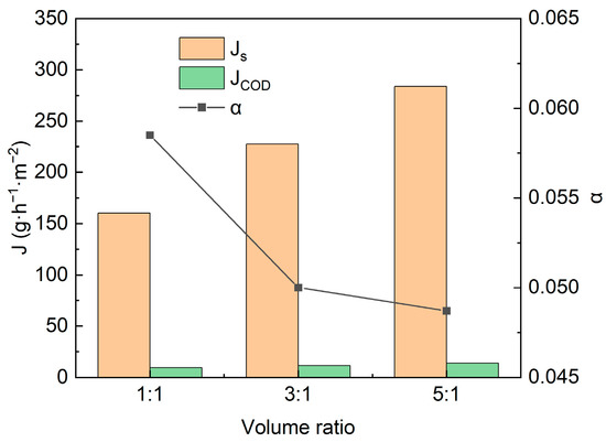 In order to better compare salt and organic migration during ED, the separation factor α was defined as the ratio of COD migration rate JCOD to salt migration rate Js, i.e., α = JCOD/JS. As can be seen from Figure 6, α reached a minimum of 0.0487 at a volume ratio of 5:1. For the migration of organics, there are two possible mechanisms: first, the diffusion of organics across the membrane, and second, the electrical migration of charged small molecule organics [28]. The results of this experiment showed that electromigration may be the main mechanism of organic matter migration, which was consistent with that reported in the literature [21]. The point was also confirmed in the diffusion experiments driven by concentration difference, which showed that the organic migration rate in the absence of an external electric field was 0.6 g·h−1·m−2, much lower than that in the electric field-driven case.